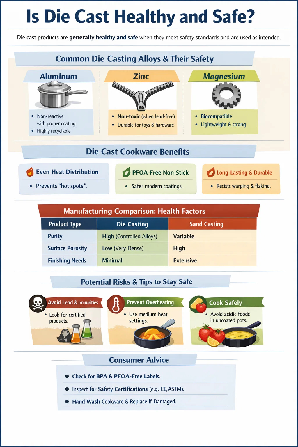 Genel olarak konuşursak, yoluyla yapılan ürünler döküm uluslararası güvenlik standartlarını karşılamaları ve amacına uygun kullanılmaları koşuluyla, günlük kullanım için sağlıklı ve güvenli kabul edilir. Bir basınçlı döküm ürününün "sağlıklılığı" öncelikle kullanılan ana metale (alüminyum, çinko veya magnezyum gibi) ve ona uygulanan yüzey işlemine bağlıdır. Pişirme kapları bağlamında, basınçlı döküm alüminyum, uygun şekilde kaplandığında reaktif olmadığından oldukça popülerdir; oyuncaklarda ve donanımlarda ise, döküm çinko, dayanıklılığı ve kurşun gibi toksik katkı maddelerinin bulunmaması nedeniyle tercih edilir.