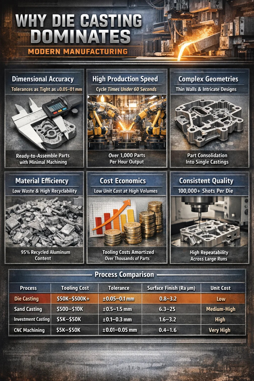 Bu makale, boyutsal doğruluk, hız, malzeme verimliliği, maliyet ekonomisi ve rakip süreçlerle nasıl karşılaştırıldığını kapsayan, basınçlı dökümün modern imalatta neden baskın konumunu tam olarak koruduğunu açıklamaktadır.